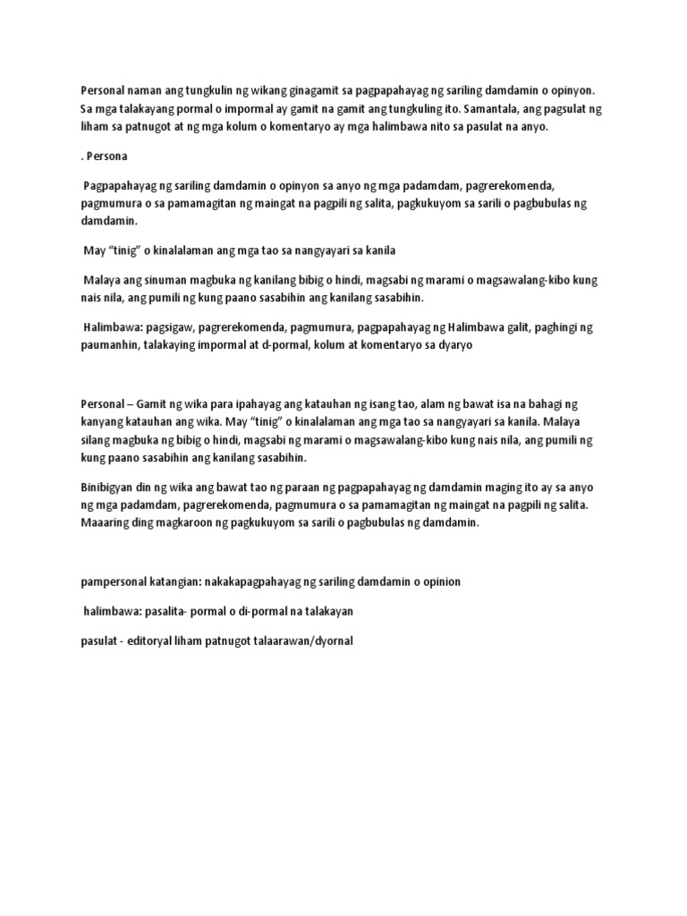 Kahulugan ng personal na wika. Walang ipinagbabawal na paksa walang istraktura ang inireseta. Ito ay tumutukoy sa ekstrang kahulugan na ikinakabit sa isang salitadepende sa intensyon ng nagsasalita o sumusulat. Gamit At Tungkulin Ng Wika.