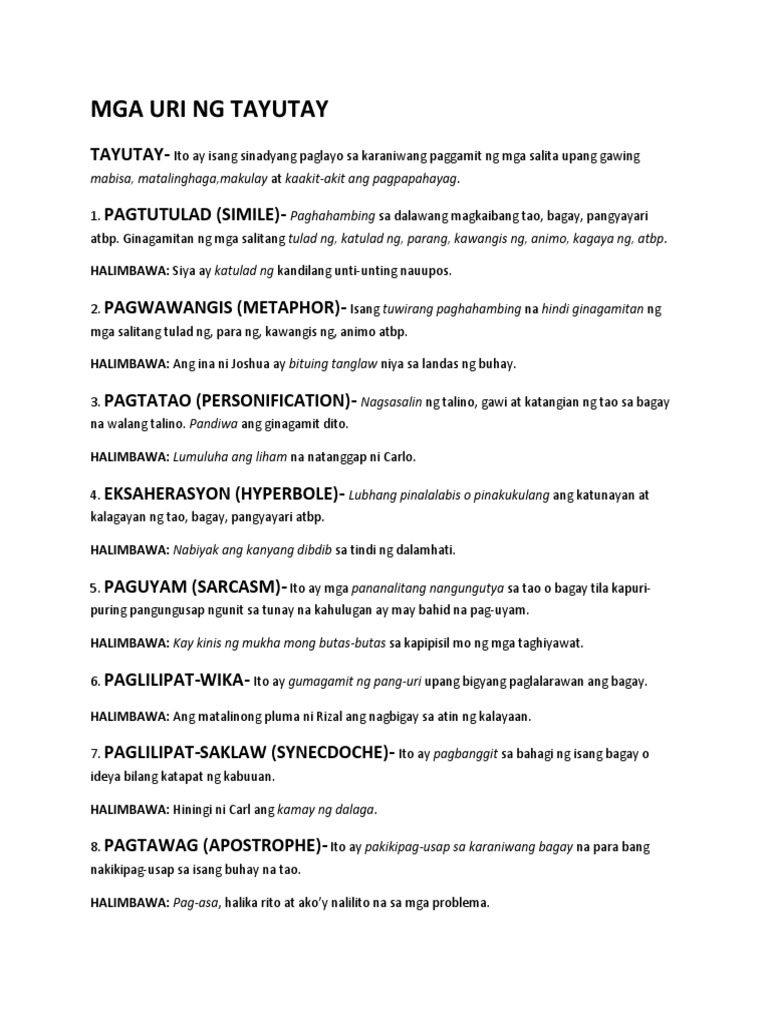 Add your answer and earn points. PAGHIHIMIG ONOMATOPEIA Ito ay gumagamit ng kaugnay sa tunog o himig ng mga salita upang ipahiwatig ang kahulugan Halimbawa. Ang tayutay ay salita o isang pahayag na ginagamit upang bigyan diin ang isang kaisipan o damdamin.